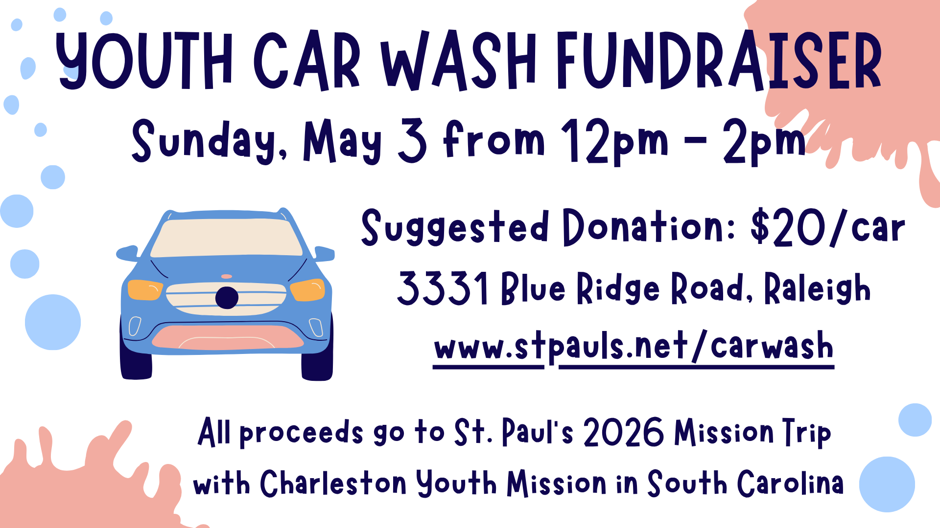 For $20, St. Paul’s youth will hand wash and dry the exterior of your car. To maximize efficiency, you will remain in your car for the entire experience! Payment is accepted via cash or through St. Paul’s Online Donation platform, which accepts Venmo, PayPal, Google Pay, Debit Card, Credit Card, or ACH.